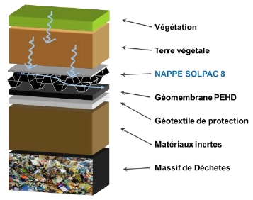 La Nappe Solpac agit comme une barrière qui draine les eaux provenant des infiltrations, l’empêchant d’atteindre les couches inférieures et d’éviter la saturation et sa mise en charge puis d’améliorer la durabilité de la barrière d’étanchéité, puis de réduire les coûts de construction et d’entretien.
