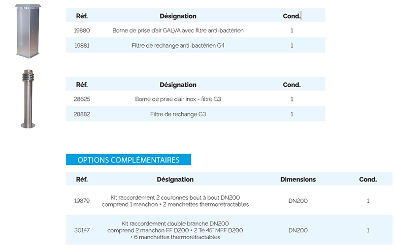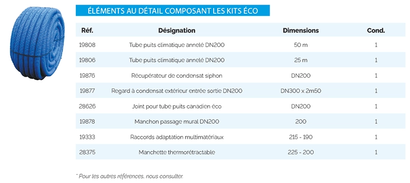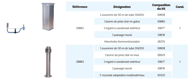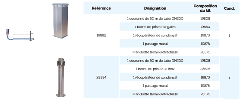 Composé d’une borne de prise d’air avec filtre anti-pollen et anti-bactérien, un manchon pour passage mural Ø200 mm, un conduit puits climatique de 50 ml en Ø200 mm et un siphon.